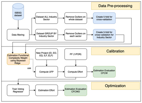 Many companies around the world contribute to the ISBSG dataset, so the locality problem can be solved. In addition, the 2020 database update addresses the out-of-date issue. Many recent studies (for example, [25,26,27]) used the industry sector (IS) as a categorical variable for dataset segmenting in their research. Our study tested a second approach—the calibration of functional complexity weight with optimisation based on an ensemble model called the voting regressor (CFCWO).