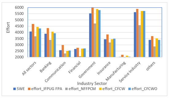- IFPUG FPA [37]—effort is computed using the IFPUG approach; IFPUG-based complexity weights and PF (PDR) from the dataset (mean from all sectors or based on each sector);