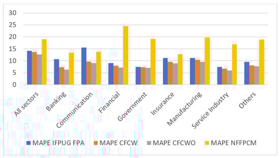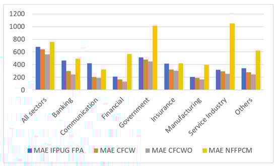 For each evaluation criterion shown in Table 4, Table 6 and Table 8, we can observe that the value in the CFCW column is always smaller than the value in the corresponding IFPUG FPA or NFFPCM column. Figure 6, Figure 7 and Figure 8, depicting the results of the MAE, MAPE, and RMSE evaluation criteria, respectively, also show that the estimation errors for the CFCW algorithm are always better than the estimation errors for the IFPUG FPA and NFFCMP methods. This means that the proposed CFCW algorithm outperforms the IFPUG FPA and NFFCMP methods. The percentage improvement of the CFCW method in terms of accuracy compared with the IFPUG FPA method was MAE = 5.46%, MAPE = 4.10%, and RMSE = 10.39% for all sectors. When CFCW is compared to NFFCMP, those figures are MAE = 15.39%, MAPE = 28.41%, and RMSE = 19.9% for all sectors.