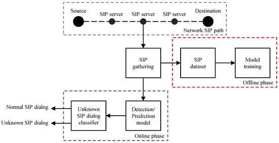 The methodology to detect abnormal SIP dialogs can be implemented locally at each SIP server or SIP peer. Additionally, the SIP peers or servers can also send the SIP messages to cloud services running the proposed methodology. The methodology is fed by the information collected in the consecutive SIP messages exchanged between the SIP Source and SIP Destination nodes, represented in the figure by the “SIP gathering” block. Specifically, the “SIP gathering” block is responsible to organize the multiple SIP messages into a SIP dataset that is used for training purposes in an offline manner. The block model “Model training” implements the training of the neural networks and the computation of the abnormal classifiers’ thresholds. Additionally, the “SIP gathering” block also feeds the SIP messages processed in the SIP path to the “Detection/Prediction model” block. The “Detection/Prediction model” block implements the neural network models trained offline and provides the input to the abnormal SIP dialogs classifiers represented in the figure by the block “Unknown SIP dialog classifier”.