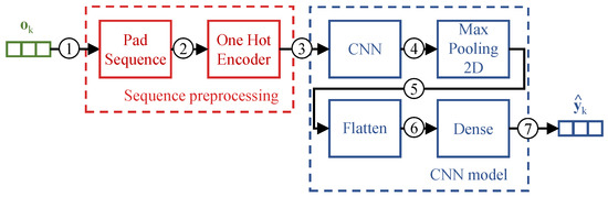 Step 3:The One Hot Encoder block encodes each element of s k (SIP messages and padding symbol) into an orthogonal Boolean vector. The length s k is changed into 1 × N × L M × 1 . At this stage, the observed sequence is ready to be processed by the CNN model.