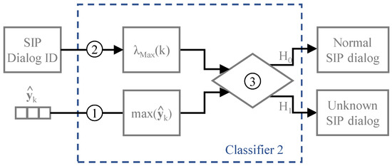The conceptual model for the maximum output-based classifier is described in Figure 5. Regarding the steps represented in the conceptual model, in the first step, the classifier computes the maximum value of the neural network output. Then, in the second step, the threshold value corresponding to the detected SIP dialog identifier is returned from λ M a x . Finally, with the coefficients assigned, the classifier evaluates which of the hypotheses holds true.