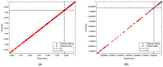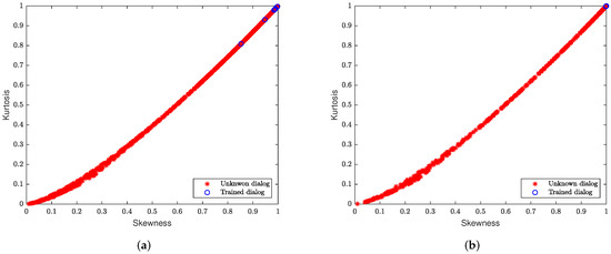 In the first classifier, proposed in [7], the detection of unknown SIP dialogs is based on statistical information computed from the output vectors y ^ k of the neural network, particularly the skewness and kurtosis standardized moments. Therefore, the first step to be taken is to compute the skewness and kurtosis standardized moments, i.e., S k e w ( y ^ k ) and K u r ( y ^ k ) . Then, in the second step the classifier evaluates the statistical information collected from y ^ k and classifies the SIP dialog as already trained/known dialog (hypothesis H 0 ) or unknown dialog (hypothesis H 1 ). The abnormal SIP dialogs are included in the unknown dialogs, and only a further analysis of all unknown SIP dialogs allows the evaluation of its vulnerability level.