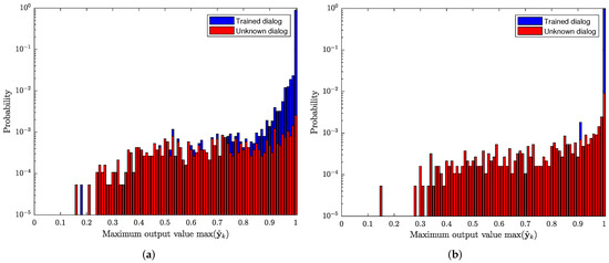 Rather than computing the standardized moments of the set of features, the second classifier detects possible unknown dialogs by comparing the output inferred by the CNN model y ^ k with the outputs from the SIP dialogs previously trained. Specifically, whenever an observed SIP dialog is detected, the maximum output-based classifier compares the maximum value of the CNN output vector max ( y ^ k ) with an average threshold value λ M a x ( k ) computed with the trained SIP dialogs. The threshold value λ M a x ( k ) represents the average of the maximum output value from each SIP dialog labelled as trained dialog. However, the classifier’s threshold is not computed based on the average of the maximum output of all trained dialogs. Instead, we compute N average thresholds, once per unique SIP dialog as represented in the vector of thresholds λ M a x = < λ M a x ( 1 ) , λ M a x ( 1 ) , , λ M a x ( N ) = k N max ( y ^ N ) k N > , where k N denotes the number of occurrences of dialog d N in the training subdataset. Therefore, the classifier compares the maximum value of the predicted SIP dialog identifier y ^ k with the corresponding threshold value λ M a x ( k ) . The decision between a trained dialog (hypothesis H 0 ) or an unknown dialog (hypothesis H 1 ) is written as