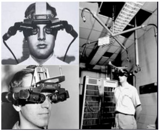 In 1966, Ivan Sutherland made the so-called “Sword of Damocles” (see Figure 2). The first helmet was equipped with lenses for AR. It made it possible to view images superimposed on the real world. It was developed to help helicopter pilots land at night by operating cameras with the movement of their heads. It took the name of Sword of Damocles as this mechanism, due to its excessive weight, was attached to the ceiling using a rotating arm that assisted the movement of the head [7,8,9].