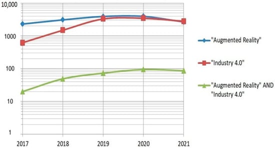 Trend of scientific articles published on Scopus in the last 5 years relating to the keywords “Augmented Reality”, “Industry 4.0”, and “Augmented Reality” AND “Industry 4.0”.