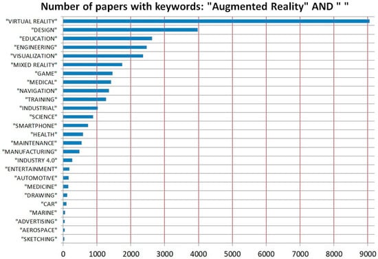 Another interesting statistic can be obtained, again by checking the SCOPUS database, of the number of scientific articles that show the keyword “Augmented Reality” with another keyword that is indicated in the left column in Figure 8 (for example, “Design” or “Game” or even “Industry 4.0”. The result obtained, visible in Figure 8, lends itself to numerous reflections.