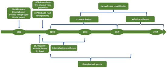 - Lorenz, K.J. Rehabilitation after total laryngectomy—A tribute to the pioneers of voice restoration in the last two centuries. Front. Med. 2017, 4, 81. [Google Scholar] [CrossRef] [PubMed] [Green Version]