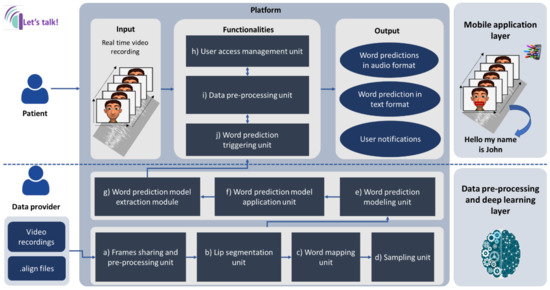 The current work emphasizes the requirements of the users of the Let’s talk! application! as well as the application architecture emphasizing the four main users of the system (patient, data provider, data analyzer, cloud computing system administrator). The two-tier architecture of the system consists of 10 units related to: (i) sharing and pre-processing of frames, (ii) isolation of the lip area, (iii) word mapping, (iv) sampling, (v) creating word prediction models, (vi) verifying word prediction models, (vii) exporting word prediction models, (viii) identifying and managing users, (ix) preparing data and sorting word prediction models, (x) implementing of the word prediction model.