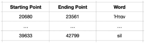 More specifically, the word annotation process was done by combining the speech of the patient with the spectrogram in Praat. This was achieved by matching the information from the curves regarding the height, intensity, and the vocal pulses. Then, the text was divided into words and for each word the starting and ending time point was manually annotated by the experts in milliseconds (ms). The time intervals which correspond to silence were annotated as “sil” whereas the speech errors as “err”. This process was applied for each video recording yielding an individual align file.