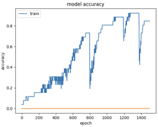 The accuracy of the model during the training process is shown in Figure 6 which confirms the upward trend of accuracy in increasing the number of epochs giving a maximum accuracy of 84% in the last 500 epochs (85% in the last 100 epochs). However, it is necessary to use more data input frames to avoid overfitting phenomena that affect the performance of the model during training, noting fluctuations in the value of accuracy during the epochs.