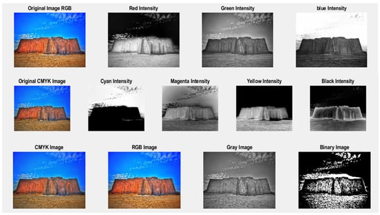 In this work, there are two concepts of image encryption, color mode and color code, that need to be considered in data encryption. Color mode encoding is a group of different colors that are mixed to obtain the color required to display the image on the screen or to print it from a printer [12]. How colors are combined using different color schemes is usually determined by the number of channels in a given color model, so various color schemes result in different levels of color detail and file size. Color code encoding is a system used to show data in the form of different colors where there is a code for each color that is drawn from a table defined by the particular application used [12,13]. For example, the letter ‘A’ represents black and so on. This system is used in several applications, including the color to value encoding of electronic resistors [13], as well as in programming languages, especially in the HTML markup language. The color space system, including RGB color system (three color channels red, green, and blue, 24 bits of data per pixel, and 224 unique colors available), the grayscale system (one intensity channel, 8 bits of data per pixel, and 28 colors available), the CMYK color system (four color channels cyan, magenta, yellow, and black, 32 bits of data per pixel, and 232 of colors available), and the binary system as shown in Table 1 and Figure 3.