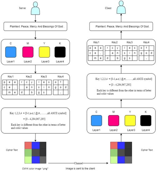 By default, four keys were used in this paper, each layer has its own key, and as previously mentioned, it is possible to use several keys according to the programmer’s desire. Each letter takes a color, in CMYK this is a 32 bit number of four possible colors with 256 levels each. The first key is for Layer 1 (cyan), the second key is for Layer 2 (magenta), the third key is for Layer 3 (yellow), and the fourth key is for Layer 4 (black). All keys are entered by the sender according to the language to be encrypted: English, Arabic, Hindi or any other language. This is one of the advantages of this work. It is also possible to encrypt a text consisting of letters in various languages. In this work, four keys were used; each key was 37 characters long.