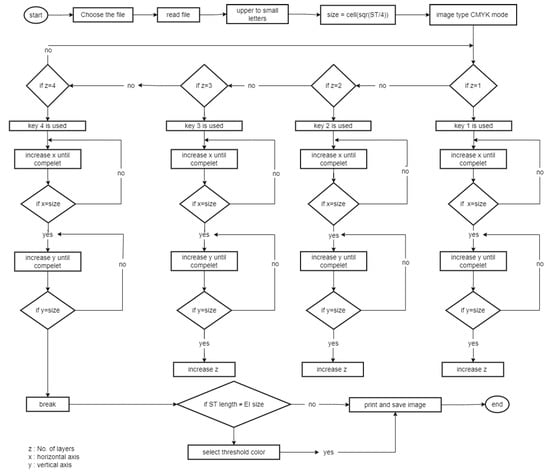 This mode consists of four layers—CMYK. This can increase the number of characters that are loaded to each pixel in each layer, and thus the capacity becomes four times that of previous studies. Only four keys are used. This implies that depending on the programmer, eight keys per layer can use two keys, or 16 keys per layer can use four keys.