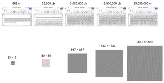 All experiments were carried out using Python on a computer with an Intel Core I7 2.6G Hz CPU, 8 GB of RAM, and 64-bit Windows 10 operating system. Table 2 illustrates the proposed work with different lengths of text, dimensions, number of keys, types and sizes of the images. The encrypted images of the proposed algorithm for different lengths of text from 668 into 25 million characters are shown in Figure 7.