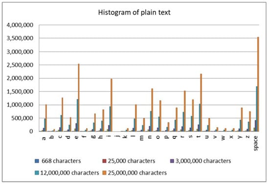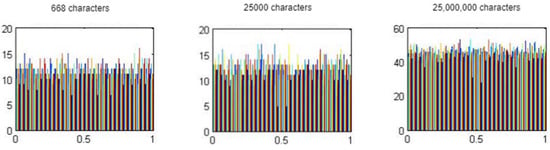 The histogram of the ciphered image should be significantly different from the histogram of the plain image, and the histogram of the ciphered image should be as uniformly distributed as possible, which means that the probability of the existence of any color scale value is the same, and it is totally random [22,23,24]. Figure 8 shows the histogram of plain text, and Figure 9 shows the ciphertext for different text lengths.