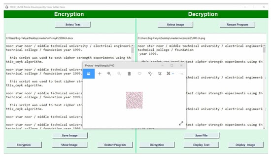 - Size of encrypted image (EI size): The decryption process depends mainly on the size of the encrypted image received by the recipient through the size of the image, and after several calculations are made on the image, the encrypted text is extracted based on the following equations:where Equation (1) is to find the size of image encryption and Equation (2) is for the text size that is proportional to the dimensions of the image encryption.