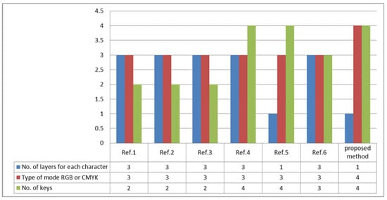 TTIED-CMYK is proposed in this work to improve security and increase the capacity of the number of characters in TTIED-CMYK image. Figure 12 clears the proposed work and previous studies in terms of number of layers, number of keys, type of mode—CMYK and RGB. It is clear that our proposal is better than others. The number of keys is increased with mode type CMYK. Table 8 shows the comparison between CMYK and RGB mode.