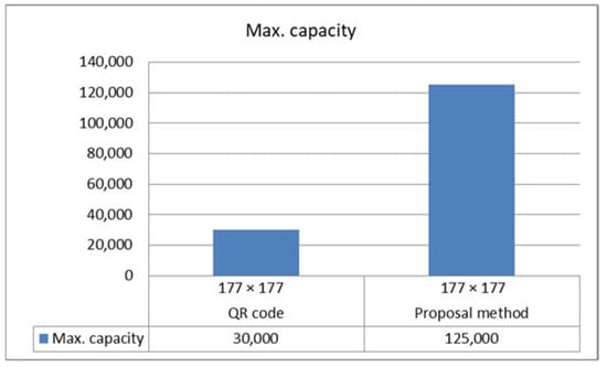 Dimension of QR code version 40 equal 177 177. The maximum capacity is ~30,000 bytes [44,45]. However, CMYK mode takes the same size as the QR code. Thus, the capacity 177 177 4 equals ~125,000 bytes.
