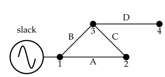 where i corresponds to the node number, to the node phase, j corresponds to the line, and corresponds to the line phase. Note that nodes 1, 2, 3, and 4 are placed vertically along with the lines A, B, C, and D, respectively.