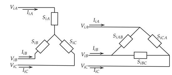 The three-phase demand current depends on whether the type of connection of the load is in or Y (i.e., star connection); see Figure 3 for this case study, which is taken as reference for a kind of load in Y. Therefore, Equations (25)–(27) were selected. Likewise, Equations (28)–(30) are detailed if the type of load is in triangle [6].