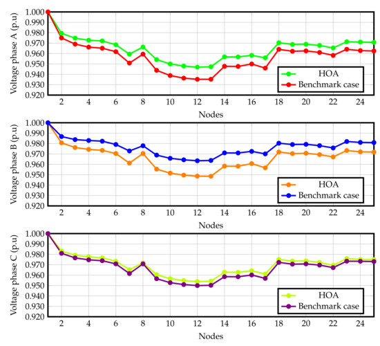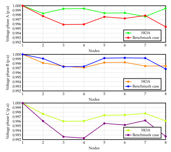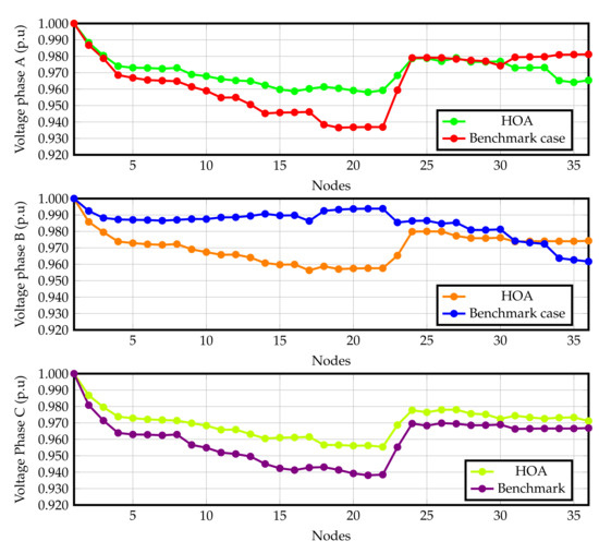 An in-depth study has been carried out to determine the feasibility of this proposed method as an optimal solution to phase balancing in distribution systems, detailing a master–slave optimization, which works as follows: Master phase: The arrangement system to be evaluated with its respective set of connections is determined [3]. Slave phase: Employing the three-phase iterative sweep method, it is a solution to the power flow and, specifically, the power losses in the system under study is determined [6], corresponding to the set of connections described in the master phase. HOA is applied to determine the number of possible connections and their location in space, thus obtaining the best connection set selection for the studied system.