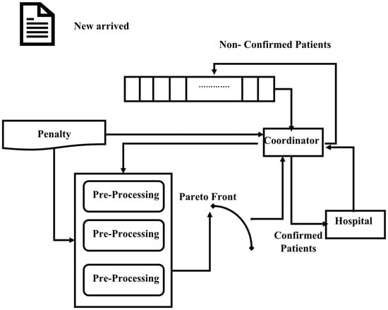 Patient Admission Scheduling (PAS) is an NP-hard problem []. Ref. [] addressed the PAS problem using a combinatorial formulation of Integer Linear Programming (ILP) and the Tabu search algorithm. They aimed to determine patients’ optimal bed assignment schedule using prior knowledge concerning hospital departments, room capacity, bed availability, specialties, equipment, and qualitative aspects, including patient preference based on gender, age, and room matching. The method provided good results with relatively small and medium data sizes. However, this work is challenged from several perspectives: an offline approach is impractical due to the dynamic aspects of the problem; taking a weighted average of the soft constraints can result in sub-optimal outcomes due to model non-convexity; this method presents only a single optimal solution, resulting in limited choices available to the decision-maker []. Other researchers [] presented two Mixed Integer Programming (MIP)-based heuristic approaches, namely Fix-and-Relax (F&R) and Fix-and-Optimize (F&O), where PAS problem instances are decomposed into sub-problems, which are then optimized. Specifically, the solutions generated by the F&R heuristic are used as inputs for the F&O heuristic to optimize the solutions. Patient Length-of-Stay (LOS), room preference, admission date, specialty requirement, and age are the factors considered for problem and time decompositions considering different optimization window sizes. Another team of researchers [] proposed a different formulation extending the study by []; they used the dynamic patient-to-room assignment problem, which helped reduce the number of decision variables, lessened the computation of different values of lower bounds by omitting some constraints, and adapted simulated annealing to find the best solution. The study by [] was improved by [] using two levels of heuristics or hyper-heuristics comprising the addition of local search moves. This work used the great deluge algorithm for hyper-heuristics. It was found that the hyper-heuristic approach to the patient admission scheduling problem significantly outperforms the Tabu search approach. However, this research was criticized by [] for the limitations of its deluge algorithm’s linear decay rate, which was improved to a non-linear adaptive decay rate using the same soft and hard constraints []. The results have shown the importance of adaptive parameters for meta-searching. In the work of [], the scheduling objectives were arranged as short- and long-term objectives and periodic re-optimization was used. Lower bounds were calculated using Dantzig–Wolfe decomposition and column generation. The results showed that the proposed short-term strategy produced long-term solutions of significantly better quality than the best-known strategy for 26 out of the 30 instances. Researchers [] created a scheduling algorithm for planning medical tourist travel to Destination Medical Centers (DMCs). The objectives were to minimize patient delay, preferred starting day, and patients flow time. They used flow-shop scheduling and implemented optimization using Tabu search, simulated annealing, and simulations. The process is based on discrete event simulation that evaluates the solution, considering admission day, admission time, and patient sequence as decision variables over a one-day interval. The results show that average patient flow time increases significantly when patients arrive in batches, rather than every patient having a specific start time every day. In the work of [], the existing deterministic model developed by [] was modified to incorporate stochastic aspects. They used the Poisson distribution and discrete phase-type distribution to model arrivals and departures, respectively. Hence, their model became a stochastic variant of the older deterministic model. Appointment time modelling based on patient requirements and doctor performance (i.e., speed factor) was proposed. Their model is implemented using a solver for small scale problems and the genetic algorithm for more significant problems. However, it ignores multi-objective handling from the non-dominated sorting perspective.