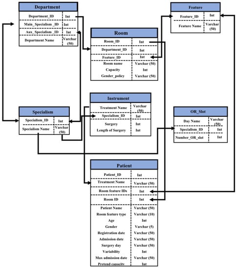 In order to evaluate our developed window-based multi-objective optimization for solving the dynamic patient admission scheduling problem, we used the data provided by []. The data are described by the entity-relationship diagram depicted in Figure 2 The data includes seven entities: patient, treatment, specialty, department, room, feature, and operating room slot (OR Slot). The attributes of each entity are provided in the figure. Detailed descriptions are provided in [].