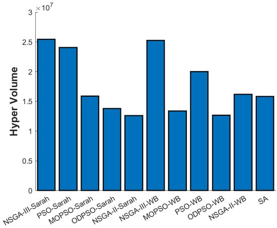 Hyper-volume was also determined for all algorithms, as depicted in Figure 4. It is evident that the proposed NSGA-III-WB and day provided the highest hyper-volume, indicating NSGA-III-WB domination and choice flexibility.