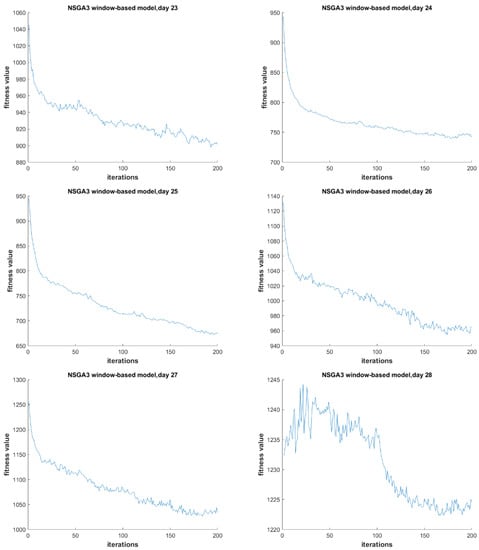 In order to elaborate on the behavior of all window-based algorithms, we present the superior NSGA-III-WB approach and its convergence curves. As shown in Figure 4, when the optimization was conducted, the cost started from an initial value and decreased until it reached the final optimal value after 150 to 200 iterations. We observed convergence behavior for all algorithms. In addition, we wish to emphasize that the decision flexibility in the window-based optimization enables patient changes to be made within a time window instead of providing greedy decisions based on the current day when the optimization is performed. Hence, this algorithm is superior to day-by-day optimization. For more elaboration, we present in Figure 5, the convergence curve of NSGA-II in some of the optimization days which show that the algorithm has accomplished an acceptable convergence in all of them.