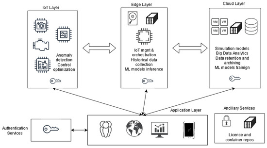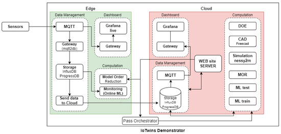 After an accurate analysis of the needs, the “to-be” scenario was developed, which included the integration with the IoTwins platform. Figure 3 shows the data flow and the operations required to implement the new scenario, and the infrastructure layers (edge and cloud) involved in the computing steps.