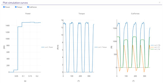 Simulation results visualization: power consumption, torque and cutting force trends.