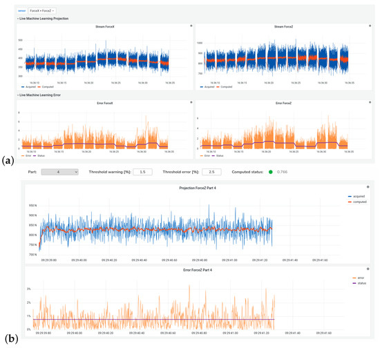 On the other hand, an ML-based production monitoring tool is proposed. Based on a sensor data subset, a digital twin model was built. By comparing the measured values on the one hand and the calculated values on the other, it is possible to deduce errors specific to each operation in the form of a time series. The characterization of this error will define a status (good, average, bad) for the current operation. Figure 7 illustrates the use of this modeling for the forces. On the top side of the image, the model built during the training phase is displayed. The blue curve shows the raw signal. The red curve superposed to it represents the model curve. Below, the error between the raw and the predicted data is drawn. This error will serve to access the quality of the manufactured part. On the bottom end of the picture, we outlined the model in action. The next step will be to bring the simulation and the ML closer together to build the hybrid twin. The modus operandi would be to complete the simulation by the ML to model the gap between the simulated data and the data captured by the sensors. This composite model would, thus, be more realistic in order to monitor the production processes.