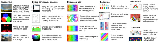 In addition, beyond the unequivocal scientific knowledge of light mixing, colour frequencies, and so on, there are many other complexities, ambiguities, and possibilities. These produce opportunities that can help motivate creative thought, critical thinking, decision-making, and other high-level thoughts. For example, naming colours, choosing colours for design work, and finding the right shade are all challenging tasks with uncertain outcomes [1]. Subsequently, working through design guidelines, discussing choices, and investigating possible decisions can lead to more open-ended discussions of design, ethics, perception, visualisation, and broader understanding of the world we live in, all essential skills for the learner to develop. In fact, human perception of colour is individual—what people see is different from other people—and colours are perceived relative to other colours, lights, and shade. Consequently, there are many colour models that have been invented, which attempt to simplify colour spaces and different ways to encode them on a computer. Thus, all these complexities can help engender deep thought in the learner, provide a range of topics that will interest him/her, and help develop his/her skills. Essentially, there are different levels of understanding: from the colourful rainbows a beginner would understand, to more complex issues of colour perception. We reflect this breadth of skills by classifying the lessons as beginner, intermediate to advanced.