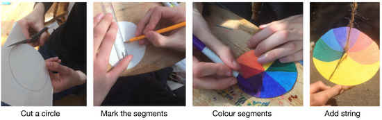 The first activity gets students to create a colour spinner. We include step-by-step instructions for how to create and use one and a downloadable template that can be printed and cut out. We use this activity to help discuss basic concepts in rainbows in nature and light (see Figure 3). We explain how rainbows in nature are formed and that the second arc of a double rainbow is reversed. We discuss different aspects of colour, such as the colours of a rainbow, as seven distinct colours, are attributed to Aristotle (384–322 BC), but they may have been developed by Aristotle’s successors Theophrastus or Strato. We explain that Newton, with his colour circle, described how coloured lights can be mixed together and that he only used five colours, but adding orange and then indigo to match with the seven notes in a major scale. This information helps to get people to critically think about colours and understand that the seven colours in a rainbow are artificially named. We link to external sites, such as Wikipedia pages, to allow people to read about the topic, discuss mixing paints versus mixing lights (subtractive and additive colour mixing), and define terms such as colour hues.