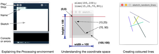 The introduction to the http://processing.org (accessed on 30 January 2022) activity gets people using the sketch environment, exploring the coordinate space, and creating randomly positioned lines.