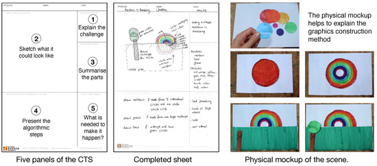 The Critical thinking Sheet (CTS) method [30,31] gets learners to think about their challenge from five complementary angles. Figure 7 (left) shows the layout of the CTS sheet and labels the five parts. First, the learner needs to ➀ explain the challenge in about two short sentences. Then, they ➁ sketch a picture of what the outcome could look like; labels can be added to help explain the parts. In Panel ➂ the main components, facets, or parts of the idea are considered. Panel ➃ allows the student to think about the process and the individual algorithmic steps that are required to implement the design. Finally, in Panel ➄, people can consider what they need to do next to implement it.