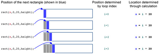 One important concept is to abstract position from location: the relative neighbouring position of the item and its actual coordinate value. In this example, we use a for loop to index position and multiply it by the object width to locate the rectangle.