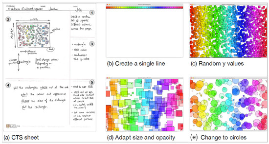 The abstraction of position and location is useful to learn. The grid x position is controlled by a single while loop to determine the order; the y value is a random number. The activity encourages learners to create a CTS [30,31] (a), then develop from a line of rectangles (b) into the grid (c), and finally, change its appearance (d,e).