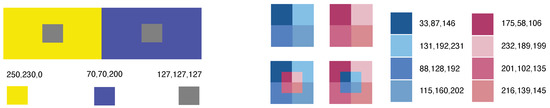 Colours can seem complex to understand at times. One issue is that our perception of colour is effected by surrounding ones. Johannes Itten names this the “colour effect” [1]. We developed several activities that explored colour effects and show how colours can be used. One activity gets students to name colours, print out blocks of colour (printing the pages in a pdf), and place them next to each other for the simultaneous-contrast effect (Figure 10 (left))—a similar activity to that of Josef Albers [45]. In another activity, we get students to explore value and allocate numbers to colours (from arrays). The activity therefore starts to introduce the principles of colour maps, linear mappings, and stored data. A further activity explores colour combinations and uses the 12-part colour wheel. Students create colourful artwork, inspired by Josef Albers’ blue- and red-coloured squares (Figure 10 (right)). Another activity looks at colour effects through line placement and transparency—creating line-art inspired designs.