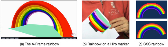 Our goals with the advanced set of activities were to cover subjects that learners may not have done and to focus on areas that were associated with computer graphics research that is being undertaken by researchers at our University [3]. These include using virtual reality, augmented reality, and visualisation tools (such as the D3.js library). For instance, we developed some rainbow activities in WebXR using A-Frame (Figure 11a) and also augmented reality rainbows (Figure 11b). Colleagues have been researching methods to move beyond traditional desktop interfaces [59] and develop interfaces to help people become immersed in their data [60]. In other work, researchers have been creating novel visualisation tools, such as to visualise and explain paths of redress in law and administrative justice [61], visualising student journeys [62], or multiple views [33,63,64]. Subsequently, we wrote an activity using the D3.js library, which is a JavaScript library to help developers manipulate documents based on data [65]. The D3.js activity was used to develop code to “sing” the colours of the rainbow. Finally, we created an activity that led learners through the steps to create a rainbow in pure CSS code (Figure 11c).