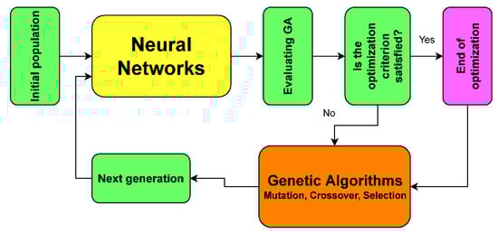 Many other studies from the machine learning field show that the combination of neural networks and genetic algorithms is very current. The combination of learning artificial neural networks using hybrid approaches (GA) is very current and is based on many studies. If these techniques are combined well, we can achieve better results than if done separately [,,,,,]. At the present time, methods of artificial neural networks and genetic algorithms are used in all possible scientific fields, from medicine to earth sciences. Their greatest use is in the form of computer applications [,,,,,,,].