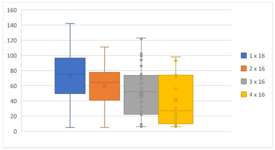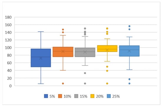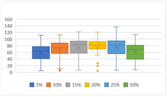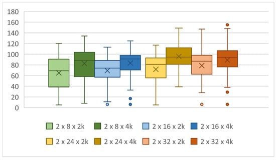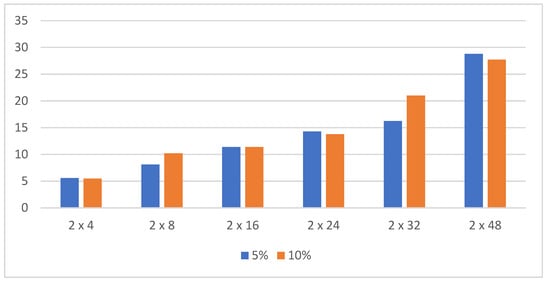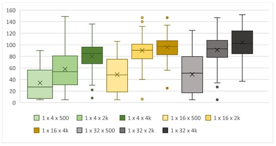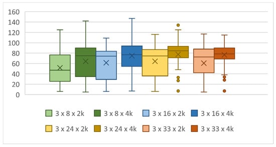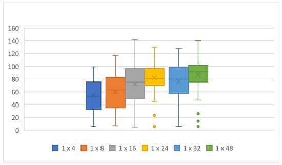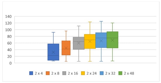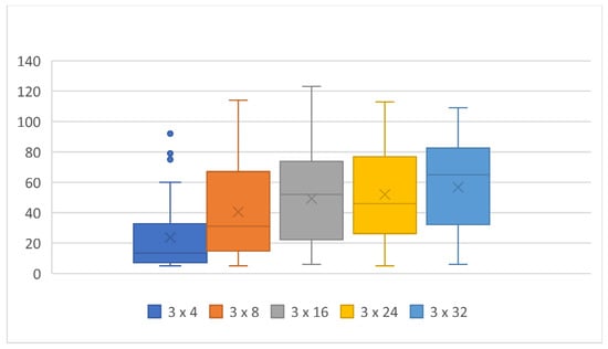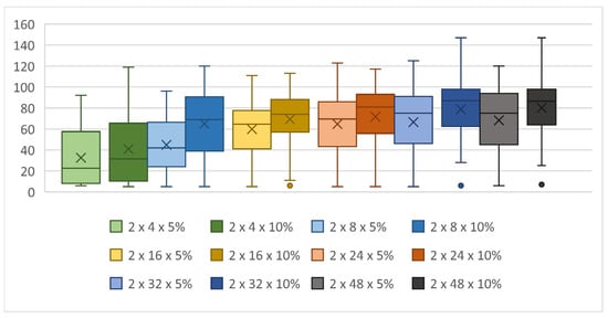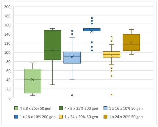 Figure 17 reveals that a 10% mutation produced significantly better results than a 5% mutation. For some topologies, the increase in both the best score and the median is more than 20%, with almost no difference in the processing time; except for the 2 × 32 topology, where the computation time was about 25% longer.