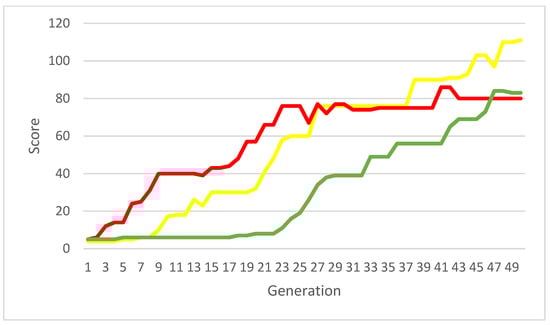We assumed that as the number of generations increased, the score increased as well. Of course, the time required to compute the entire evolution increased with each generation. To compare the learning rate capability of the NN, we chose a single terminal attribute and that was the completion of the computation of the 50th generation in one evolution. As previously shown in the results of topologies with different numbers of hidden layers in Table 7, more complex topologies with more layers performed worse when evolutions with the same number of generations were performed. However, this did not mean that they were less suitable. As shown in Table 9 and Figure 18, the number of generations had a major impact on the scores achieved, but so did the computation runtime. Topologies with more hidden layers need more generations to train the NN.