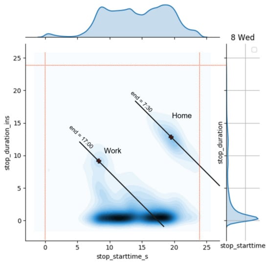 The third blob identified may be composed of stops relating to the work activities of people employed 8 h a day (full time). In fact, it is centered approximately at 8:00 with a duration of approximately 9 h, which leads to an end stop time at 17:00.
