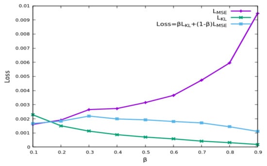 where LMSE is the reconstruction loss, typically measured by the mean squared error, and LKL is the regularization loss, typically assessed with the Kullback–Leibler divergence. Figure 2 shows the final loss behavior versus the β term. If a large value for β is chosen, the influence of the MSE decreases, and the reconstruction error increases. If a value of 0.2 for the trade-off parameter β is chosen, a low value for the MSE can be reached while maintaining a limited KL-divergence.