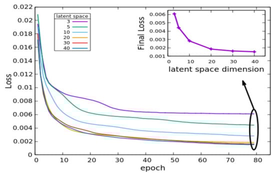 Several latent space dimensions were tested. Figure 3 summarizes both the training loss as a function of the training epochs and, in the inset, the final loss. It is evident that the larger the number of latent space units, the smaller the loss. For further processing, the latent space dimension was set to 20, since the gain in terms of loss using larger latent space dimensions is limited, while the smaller the number of units is, the more manageable the model and the related processing timings are.