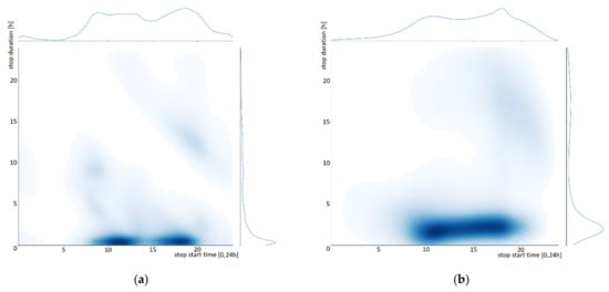 It is interesting here to observe that Figure 1 is very similar to a figure shown in []. The positions and dimensions of the above three blobs are practically superimposable. This is interesting, as the data used here relates to the GPS tracks of vehicles in the city of Rome, while in [], the CDRs of cell phones in the San Francisco Bay Area are analyzed, and activities are considered. However, if a car stop is considered as a proxy for an activity of some kind, the similarity can be explained. Another similarity is represented by the average number of activities carried out in the two cities, i.e., the average number of stops. In our dataset, there are 4.99 stops/day on weekdays and 4.04 stops/day on holidays and weekends; in [], these values are 4.4 and 4.0.