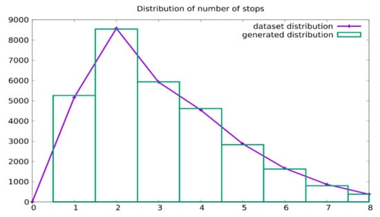 In Figure 5, the distribution of the number of daily stops, in both the training dataset and the generated trajectories, is presented. The solid line represents the dataset, while the histogram shows the generated data. The comparison shows that the statistical distribution of this quantity was grasped by the generative model.