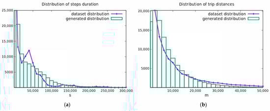 The distribution of stop durations is shown in Figure 6a. The solid line is the dataset, while the histogram describes the generated data. In this case, the overall distribution pattern is grasped by the modeling VAE, but with a lower accuracy. In Figure 6b, the distribution of the trip distances is shown. Here, the generative model resembles the dataset distribution with a higher degree of accuracy.